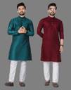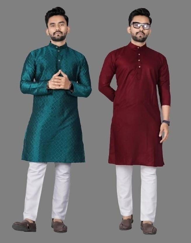 This kurta for men combo includes two men’s single kurtas made from comfortable cotton blend fabric, suitable for wedding functions, festive occasions, and puja wear. The first kurta comes in an attractive rama color with a jacquard self design pattern, while the second kurta features a rich maroon color with a plain solid pattern, offering both textured and minimal style options. Both kurtas are designed with a mandarin collar, regular full sleeves, and a knee-length fit for comfortable wear throughout the day. Each kurta includes two functional side pockets, adding everyday practicality. Ideal for searches such as kurta for men cotton, kurta for men for wedding, printed kurta for men, kurta for men puja special, wedding kurta for men, mens kurta for wedding, solid kurta set for men, and plain kurta for men, this combo pack is a reliable ethnic wear choice.