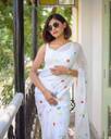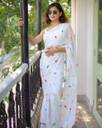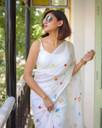 This exquisite white cotton blend handloom saree adorned with delicate multicolour floral embroidery.