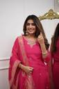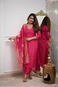 This elegant fuschia pink kurta set is a perfect blend of traditional style and modern comfort. The three-piece set features a classic round-neck kurta with a beautifully embroidered yoke that adds a touch of sophistication. It's paired with comfortable, straight-fit pants. The ensemble is completed with a stunning dupatta, which has a delicate gold woven pattern and a thick border, adding a luxurious feel. The fabric has a subtle sheen that enhances the vibrant color, making this outfit ideal for festive occasions, family gatherings, or special events.