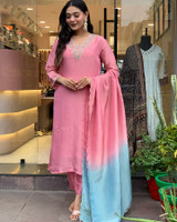 Featuring a delicate embroidered pattern on the kurta, this women’s outfit brings together a refined appearance. The well-placed embroidery introduces texture and depth, without overpowering the overall look. The solid pants beautifully contrast with the kurta, while the ombre-patterned dupatta with a trimmed border adds a modern finish to the traditional theme.