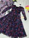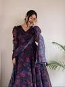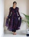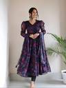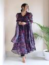 Make a bold and graceful statement in this stunning Anarkali gown set crafted in flowy pure georgette fabric with a soft crepe lining for added comfort. Featuring a dramatic floral digital print in rich hues of violet, wine, and cobalt blue over a deep black base, this ensemble brings the perfect blend of tradition and modern flair.