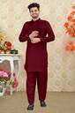 It keeps you comfortable all day long and that gives you a unique look. The pathani suit has full sleeves with cuffs, a short button placket on the chest area which further has two patch pockets on either side of it.