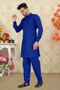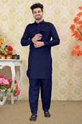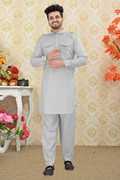It keeps you comfortable all day long and that gives you a unique look. The pathani suit has full sleeves with cuffs, a short button placket on the chest area which further has two patch pockets on either side of it.