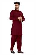 It keeps you comfortable all day long and that gives you a unique look. The pathani suit has full sleeves with cuffs, a short button placket on the chest area which further has two patch pockets on either side of it.