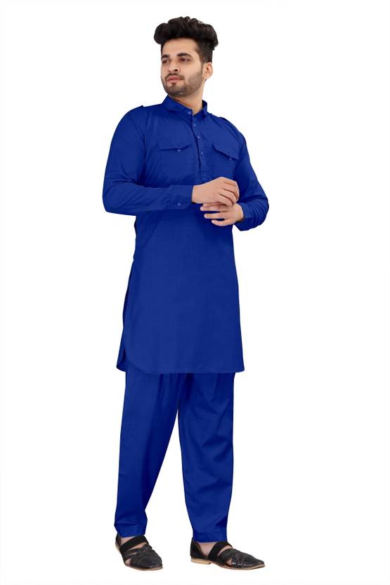 It keeps you comfortable all day long and that gives you a unique look. The pathani suit has full sleeves with cuffs, a short button placket on the chest area which further has two patch pockets on either side of it.