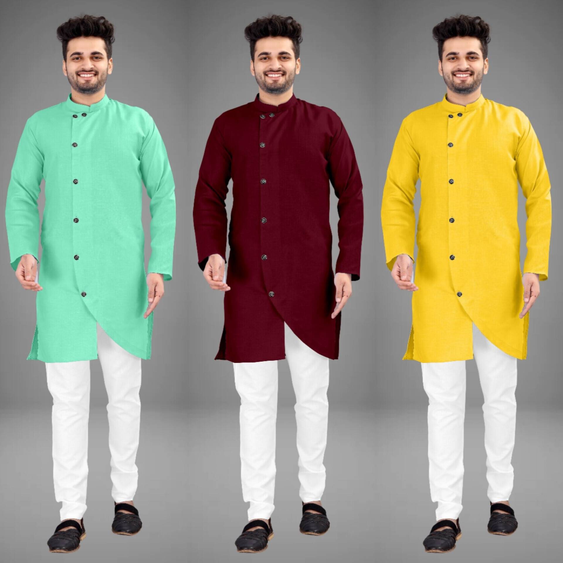 Upgrade your wardrobe with this exclusive combo of three stylish men's cross kurtas, designed for the modern man who values both elegance and comfort. Each kurta in this set is crafted with high-quality fabric, ensuring a soft and breathable feel that is perfect for all-day wear.