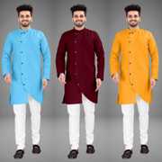 Upgrade your wardrobe with this exclusive combo of three stylish men's cross kurtas, designed for the modern man who values both elegance and comfort. Each kurta in this set is crafted with high-quality fabric, ensuring a soft and breathable feel that is perfect for all-day wear.