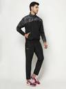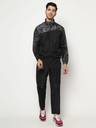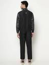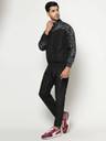 There are curvilinear lines across the fabric dividing the fabric into contrasting panels - one side solid shaded and the other printed. There's a waistband to keep the jacket in place. Reflectors aid visibility at night and zipper pockets are squarely framed. The prints stand out.