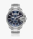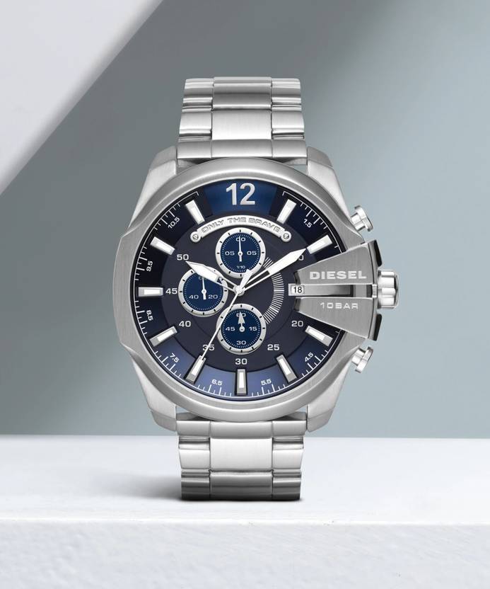 This stainless-steel Diesel Mega Chief watch features a matte blue chronograph dial with an Only the Brave tag and is complete with a single-link bracelet.