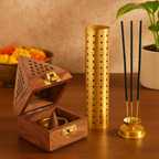 Elevate your spiritual rituals with our Wooden Dhoop Holder and Stainless Steel Incense Stick Holder Combo. This meticulously crafted set combines traditional craftsmanship with modern functionality, making it an essential addition to any pooja room, living room, or office space.