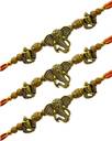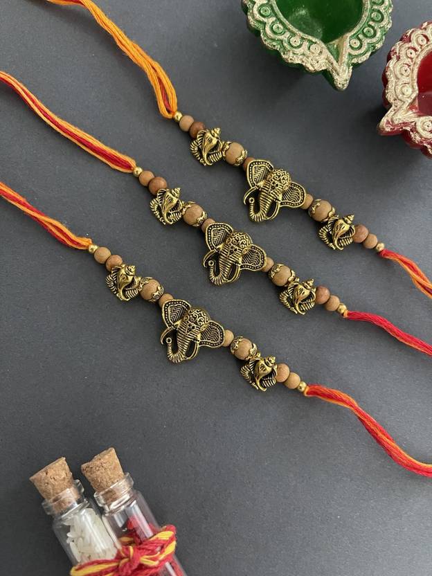 • This set of 2 has a rakhi with Chandan beads and a Ganesha-elephant motif.