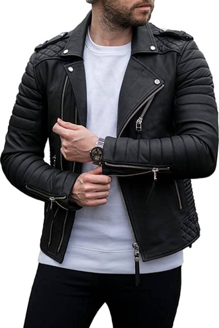 Introducing the epitome of badassery - our leather biker's jacket for men! Crafted with meticulous attention to detail, this jacket exudes an irresistible charm that will make heads turn wherever you go. Made from premium quality leather, it not only offers unparalleled durability but also a luxurious feel against your skin. The sleek design, complete with a sturdy zipper and multiple pockets, adds a touch of rugged sophistication to your ensemble. Whether you're hitting the road or simply want to make a bold fashion statement, this jacket is your ultimate companion. Unleash your inner rebel and embrace the timeless allure of our leather biker's jacket!
