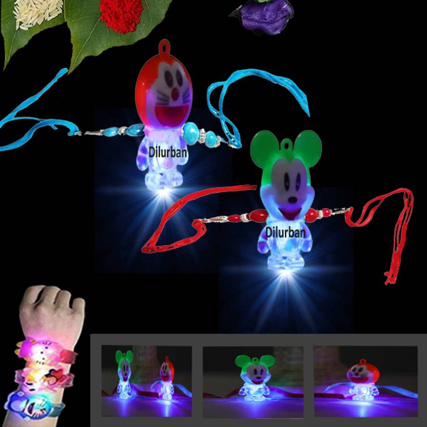 Oajao Designer MIKYDORIMON( M11 ) Mauli Thread Chawal Roli Pack, Rakhi Set (2 Pis Cartoon Character Kids LED Light Rakhi ROLI CHAWAL,)