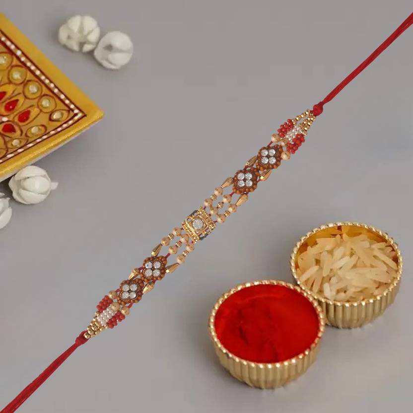 Designer P_299 Gold Finish Chawal Roli Pack Set (1 PC RAKHI, ROLI CHAWAL)