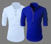Owing to their thoughtful design features, these kurtas offer both style and functionality. Moreover, with their rollable sleeves, they provide flexibility and adaptability, allowing you to customise your look according to your preference and the weather. Additionally, one of the kurtas features a zipper at the front with decorative buttons next to it, adding a unique touch, while the other kurta has functional buttons for easy wear and removal. In addition, the round neck and mandarin collar add a touch of elegance, and the straight type kurtas provide a modern and flattering fit. With their hip length, these kurtas offer a versatile length that can be paired with various bottoms.
