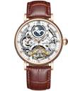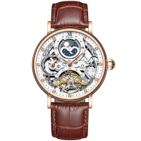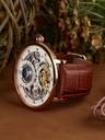 Made with dual-time precision in mind, this watch caters to the needs of globetrotters and enthusiasts alike. The small and large dials display different time zones with accuracy, allowing you to stay on schedule no matter where you are. Additionally, its innovative moon face rotates seamlessly to depict day and night transitions, while the transparent flywheel rotation offers a clear view of this wristwatch’s craftsmanship and innovation. With the ability to adjust the time effortlessly by winding up with a hand, this feature-rich timepiece has high functionality.