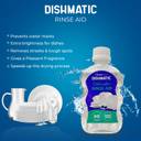 Dishmatic dishwasher rinse aid prevents watermarks and ensures brilliant spotless shine, extra brightness for your dishes, removes streaks and tough spots by quick rinsing of dishes before drying and also gives a Pleasant Fragrance to your utensils with every wash. This Rinse aid is suitable for all types of automatic dishwashers.