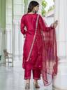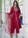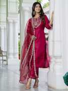 Kurta Fabric: Silk Blend Bottomwear Fabric: Silk Blend Fabric: Silk Blend Sleeve Length: Three-Quarter Sleeves Set Type: Kurta With Dupatta And Bottomwear Bottom Type: Pants Pattern: Embroidered Net Quantity (N): Single Sizes: S (Bust Size: 36 in, Shoulder Size: 14 in, Kurta Waist Size: 34 in, Kurta Hip Size: 40 in, Kurta Length Size: 45 in, Bottom Waist Size: 26 in, Bottom Length Size: 37 in, Duppatta Length Size: 2.15 m) XL (Bust Size: 42 in, Shoulder Size: 15.5 in, Kurta Waist Size: 40 in, Kurta Hip Size: 46 in, Kurta Length Size: 45 in, Bottom Waist Size: 32 in, Bottom Length Size: 37 in, Duppatta Length Size: 2.15 m) L (Bust Size: 40 in, Shoulder Size: 15 in, Kurta Waist Size: 38 in, Kurta Hip Size: 44 in, Kurta Length Size: 45 in, Bottom Waist Size: 30 in, Bottom Length Size: 37 in, Duppatta Length Size: 2.15 m) XXL (Bust Size: 44 in, Shoulder Size: 16 in, Kurta Waist Size: 42 in, Kurta Hip Size: 48 in, Kurta Length Size: 45 in, Bottom Waist Size: 34 in, Bottom Length Size: 37 in, Duppatta Length Size: 2.15 m) M (Bust Size: 38 in, Shoulder Size: 14.5 in, Kurta Waist Size: 36 in, Kurta Hip Size: 42 in, Kurta Length Size: 45 in, Bottom Waist Size: 28 in, Bottom Length Size: 37 in, Duppatta Length Size: 2.15 m)