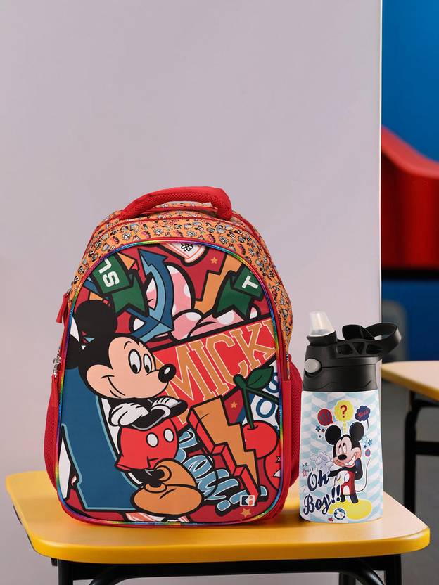 PACKAGE CONTAINS : 2 Piece ( School Bag & 350 ml Water Bottle Combo Set ) Disney Mickey ( MATERIAL : Bag- PVC Coated 1000 Deneir | Bottle-Stainless Steel ) PRODUCT DIMENSION : Bag-32 cm x 25 cm x 44 cm | Bottle-10 cm x 7 cm x 19 cm,DURABLE BACKPACK & WATER BOTTLE COMBO : Because it is made of quality materials, our backpack can handle both everyday use and adventurous activities with remarkable endurance. Not only does the accompanying water bottle provide hydration, but it also makes a statement about sustainability thanks to its eco-friendly construction and leak-proof design, which makes carrying it a mess-free experience. ,STYLISH SCHOOL BAG WITH MATCHING WATER BOTTLE : Our chic school backpack and matching water bottle will make your time in school more enjoyable. They are the ideal combination of style and utility. With its elegant style and meticulous craftsmanship, this school bag radiates sophistication and turns heads wherever it goes. Made with quality materials, it has enough resilience to handle the rigors of your hectic schedule and plenty of storage space for all your necessities.,LIGHTWEIGHT ORGANIZATION & STAY HYDRATED : Experience the perfect blend of lightweight organization and staying hydrated with our innovative combo. With its excellent organization features and lightweight design, our backpack makes it easy to carry all of your belongings without feeling heavy. Everything has a home in the numerous compartments, which helps you maintain and concentrate throughout the day. It is now simpler than ever to stay hydrated when you use our hydration solution.,ALL-IN-ONE SCHOOL-COLLEGE SOLUTION : We are pleased to present our comprehensive school-to-college solution, which is intended to simplify your academic transition from classroom to university. With a multipurpose backpack and a handy water bottle, this all-inclusive set gives you everything you need to succeed in your hobbies and academics. With its roomy storage and well-organized sections, the backpack can easily fit computers, textbooks, and other necessities.