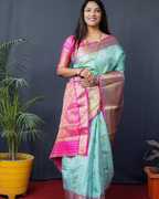 Indulge in the luxury of softness with our Cotton Silk blend, offering the best of both worlds. The breathable cotton ensures comfort, while the silk adds a touch of opulence, creating a fabric that drapes gracefully., Embrace timeless craftsmanship with intricate Zari work. Delicate metallic threads intricately woven into the fabric form patterns that exude traditional grandeur. The subtle sheen of Zari adds a regal touch, making this saree a perfect choice for celebrations and festivities., Elevate your style with the thoughtfully designed patterns and detailing on this saree. The Zari work graces the borders, pallu, and sometimes the body, creating a mesmerizing interplay of textures and designs. Each motif tells a story of skillful artistry and cultural richness., Draped in our Cotton Silk Zari Work Saree, you'll embody timeless elegance with a touch of cultural richness. Elevate your wardrobe with this exquisite piece that seamlessly combines comfort and style.