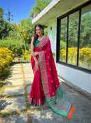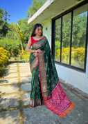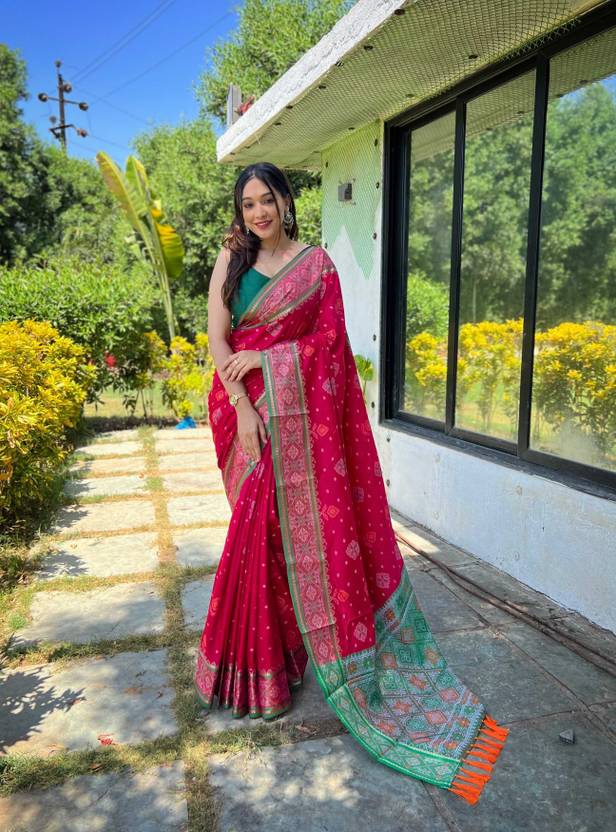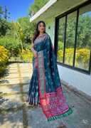 Presenting the Soft Rangeen Patola Silk Saree, an epitome of elegance and vibrant artistry. This saree features all-over Meenakari Patola weaving, showcasing intricate patterns and a rich play of colors. The luxurious pallu is adorned with detailed designs and complemented by elegant tassels, adding a touch of sophistication. Crafted from the finest silk, this saree is perfect for festive occasions and grand celebrations, embodying both tradition and contemporary style in its exquisite craftsmanship.