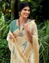 Discover A Stunning Assortment Of Beautifully Crafted Sarees At Divastri Sarees . Saree Fabric : Khadi Cotton & Blouse Fabric : Khadi Cotton :: Saree Color : Cream, Teal Blue, Green & Blouse Color : Teal Blue :: Saree Work :Floral Printed, Zari Border, Tassels & Blouse Work : Printed, Zari Border