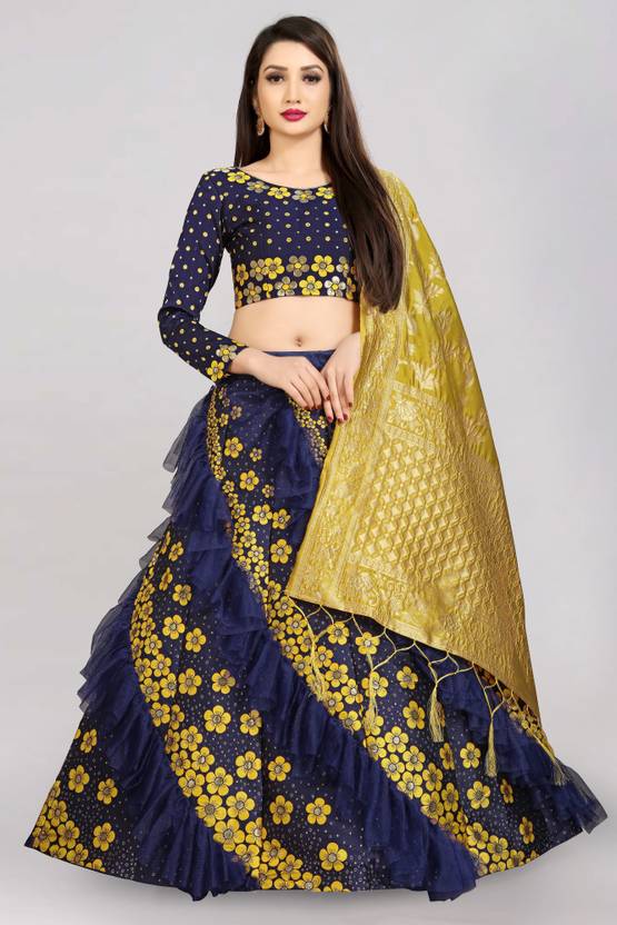 Divastri Floral Print Semi Stitched Lehenga Choli (Dark Blue, Yellow)