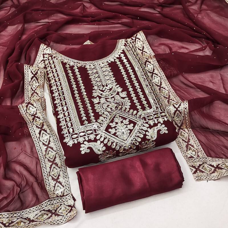 This exquisite unstitched fabric set for women combines elegance with traditional Pakistani style. The top features 2.30 meters of luxurious Georgette fabric, ideal for creating flowing and graceful garments. Complementing the top, the set includes 2 meters of heavy Santoon for the bottom, offering a sturdy and comfortable base. Additionally, 1.60 meters of heavy Santoon is provided for the inner lining, ensuring a seamless and refined finish. The highlight of this ensemble is the 2.30-meter Georgette dupatta, adorned with intricate work and diamond embellishments, adding a touch of sparkle and sophistication. This versatile set allows for customization and creativity, perfect for crafting a stunning outfit for special occasions.