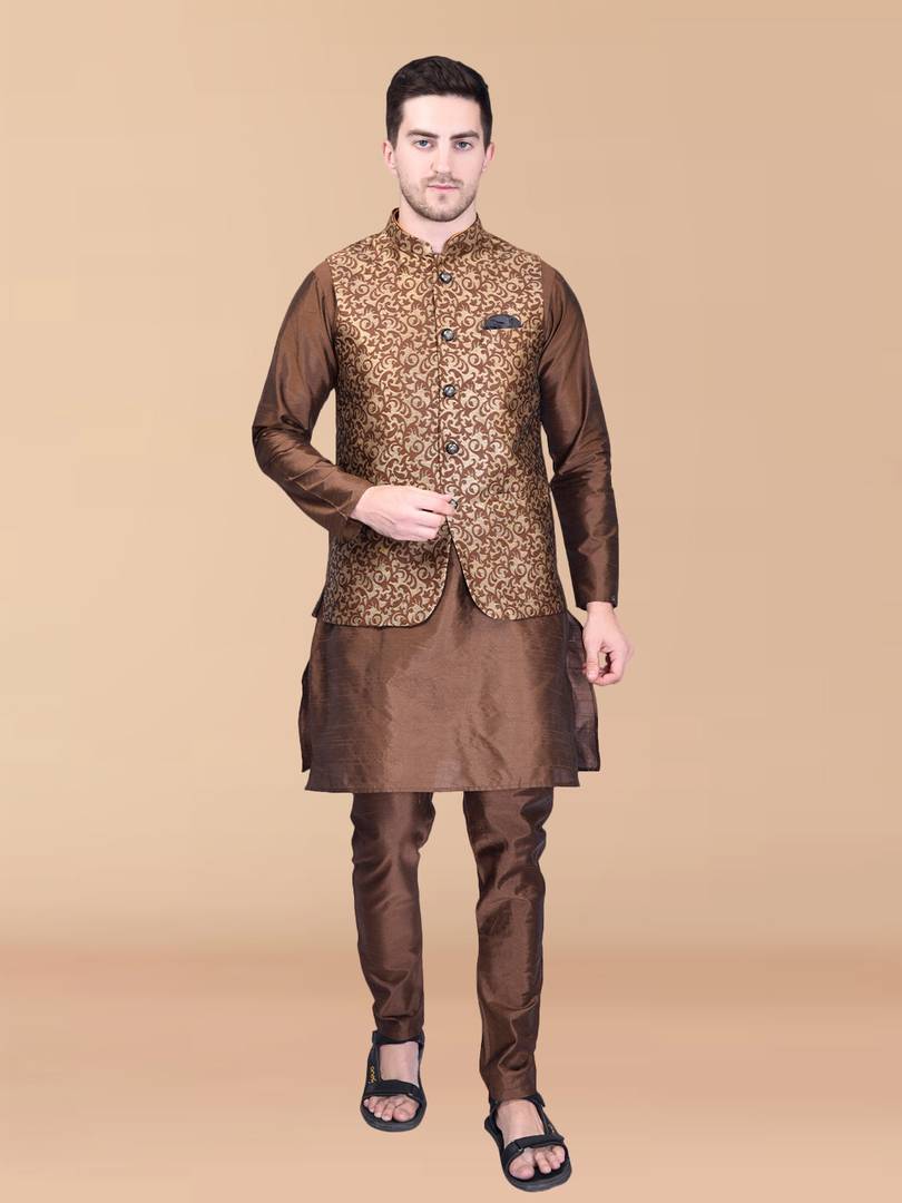 Men Silk Blend Kurta Pyjama Ethnic Jacket Set