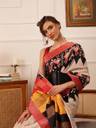 This kotha silk saree has a very beautiful floral print all over the saree and blouse. The saree has a small zari border with a contrasting color. The saree comes with an attached unstitched blouse piece, the blouse also has a digital print of ikkat. Saree has multiple colors of flowers. saree is lightweight in nature. Saree specially designed for Bengali style wear. Be ready for everyone's attention on you with this saree to any function, pujas, wedding, festive, etc. The saree is made from high-quality fabrics.