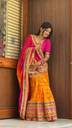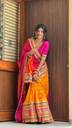 Dola silk is used for the saree, while Banglori silk is used for the blouse. Work: Heavy tessel pearl lace, a border of elaborate multi layered heavy embroidery lace, and a vibrant blouse with embroidery throughout. Type: Traditional bandhani-printed saree. 5.5 meters in length of saree and attache The blouse without stitches is 0.8 meters long. For a celebration, holiday, or wedding, wear a saree.