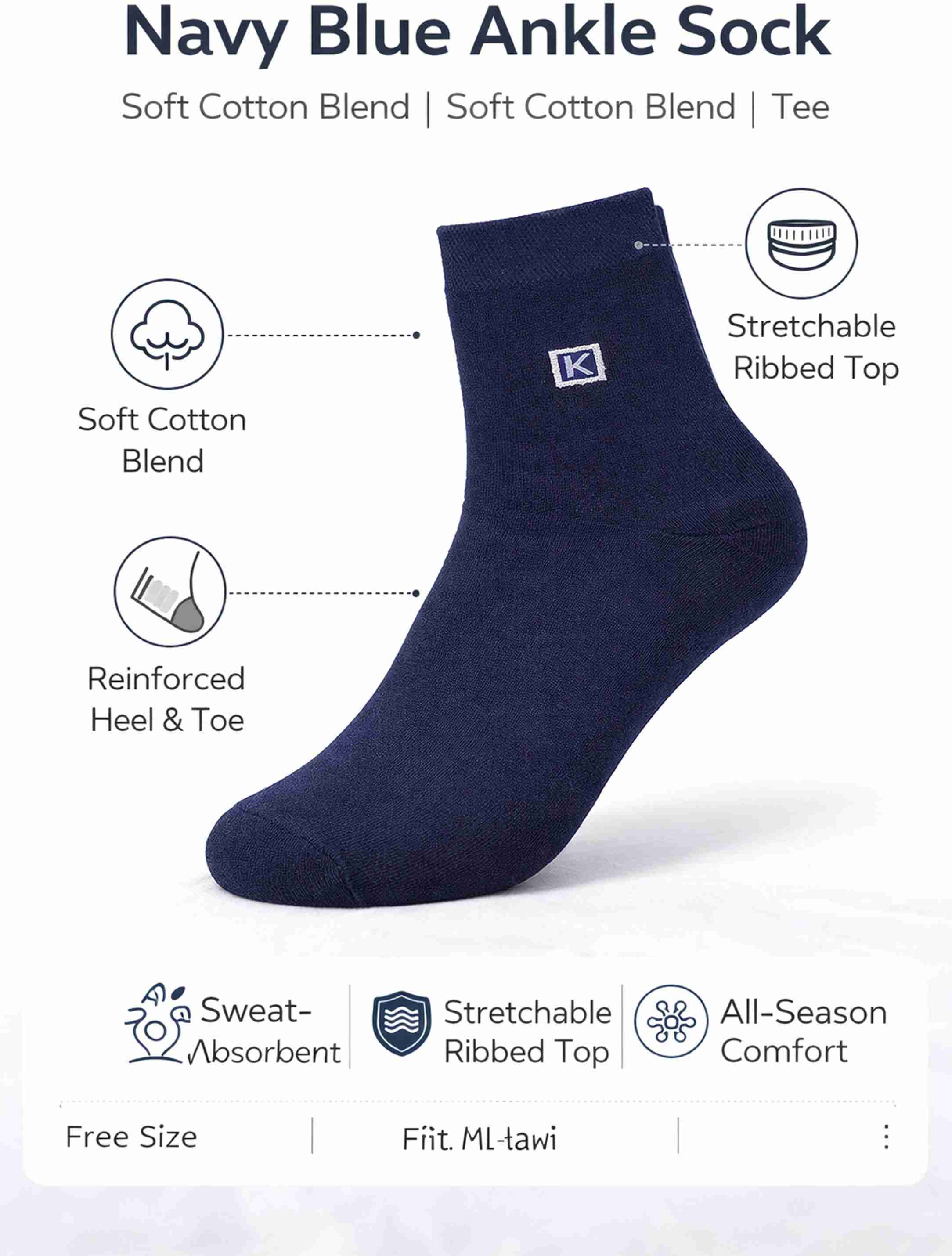 These premium ankle-length socks are made from a soft and breathable cotton blend that keeps your feet fresh and comfortable all day. The stretchable ribbed top ensures a secure, non-slip fit, while t...