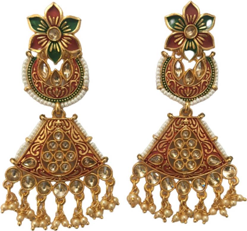 Divya Arts offers traditional, party wear earrings, brass base, gold plated ,studded with Kundan, pearls and fine quality hand Meenakari work. Amazing and evergreen color combination. Perfect Gift, suitable for special occasions as well as regular wear. Earrings length 8.5cm, width 4cm.
