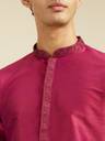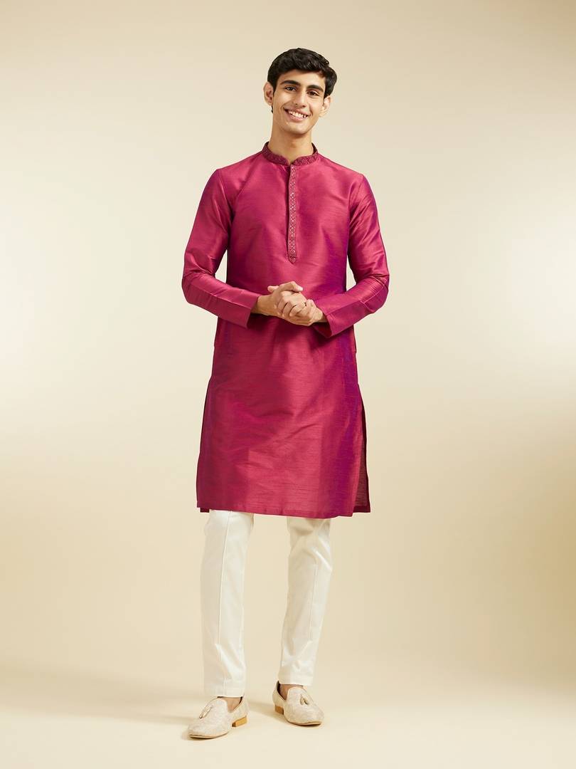 Stand out in style with our rani pink plain kurta featuring a blingy sequinned neckline. This kurta is all about making a bold statement with that pop of pink and just the right amount of sparkle. Pair it with white churidar and mojaris for a look that's pure swag.