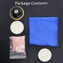 (5) Packaged Included: - Package Contents - 8pcs: 1 Bag*70g Cerium Oxide Powder 1*80mm Backing Pad 1*8mm Drill Adapter 2*80mm Wool Polishing Pads 1*Cleaning Cloth 2*Wool Felt Polishing Wheels(1*30mm+1*20mm)