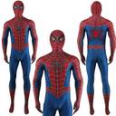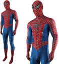 The Spider costume is a vibrant, full-body suit featuring a bold red and blue design with black web patterns. The superhero-style outfit showcases a muscular physique, complete with web shooters and a spider emblem on the chest. The mask features expressive eyes and covers the face, while the fabric is a comfortable, stretchy material. Perfect for web-slinging adventures