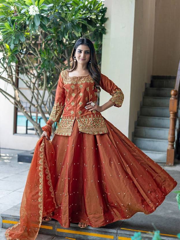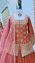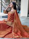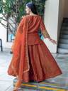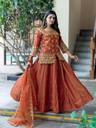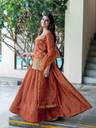The outfit consists of a structured short kurti heavily adorned with intricate gold zari and delicate pearl (moti) work, paired with a high-volume flared lehenga that creates a majestic, twirl-worthy look. The sheer organza dupatta adds a touch of ethereal grace, making it an ideal choice for daytime ceremonies and high-glam evening events alike.