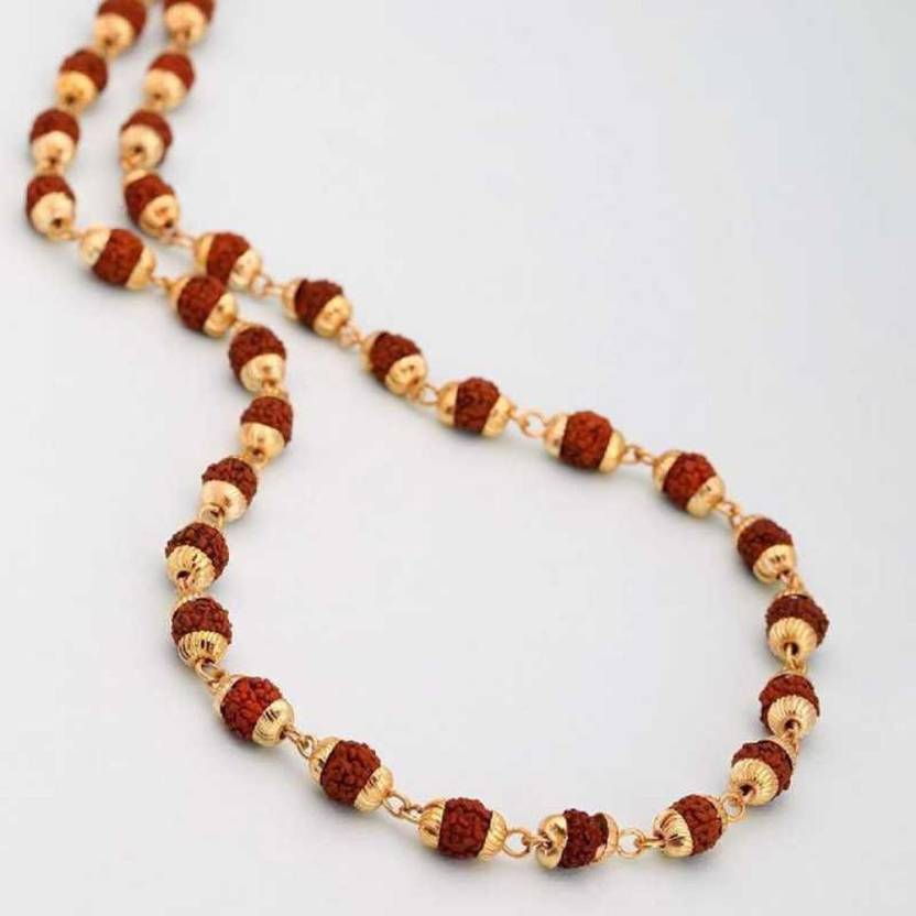 DM COLLECTION Gold Plated Panchmukhi Rudraksha Handmade Mala Beads Chain with Golden Cap Wood Necklace
