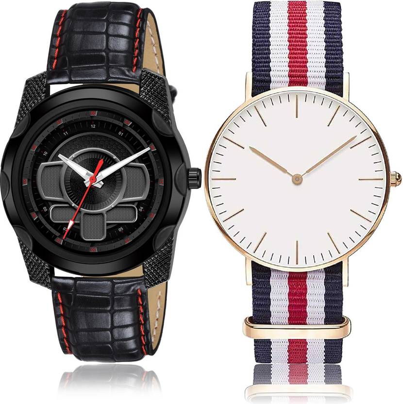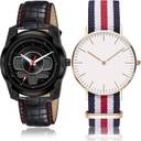 Dial Colour : Black And White ; Band Colour : Black And Multicolor ; Case Shape : Round ; Band Material : Genuine Leather And Fabric ; Case Diameter : 45 And 40 mm ; DMAGNATON Contemporary Traditional professional and chronograph Black And Multicolor Colour Analog Genuine Leather And Fabric Belt 2 Watch Combo For Boys And Men - S108-BC5