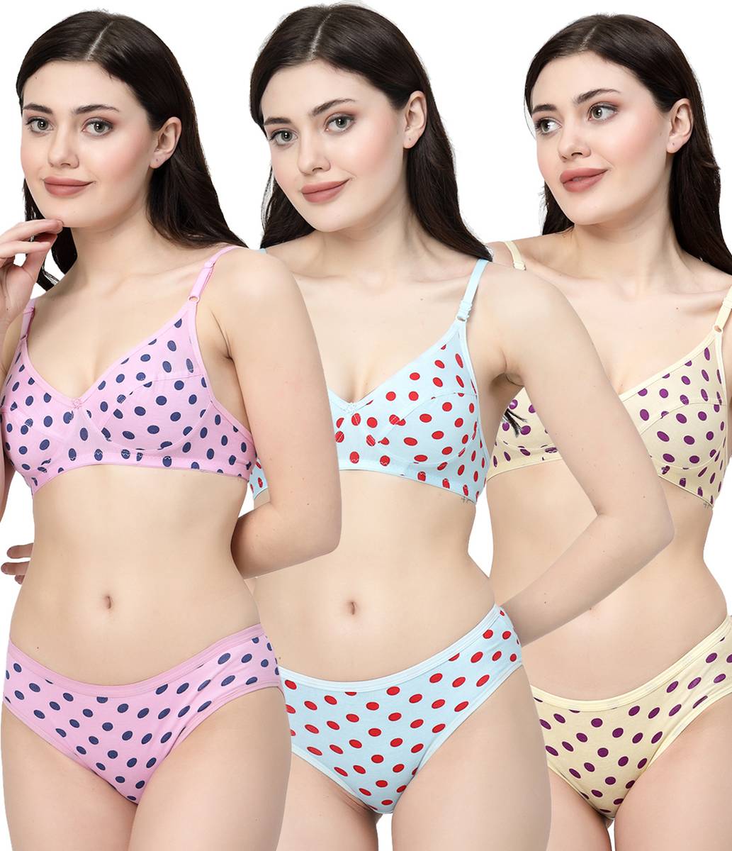Bra & Panty Set Polka Print Pink, Light Blue, Yellow Lingerie Set