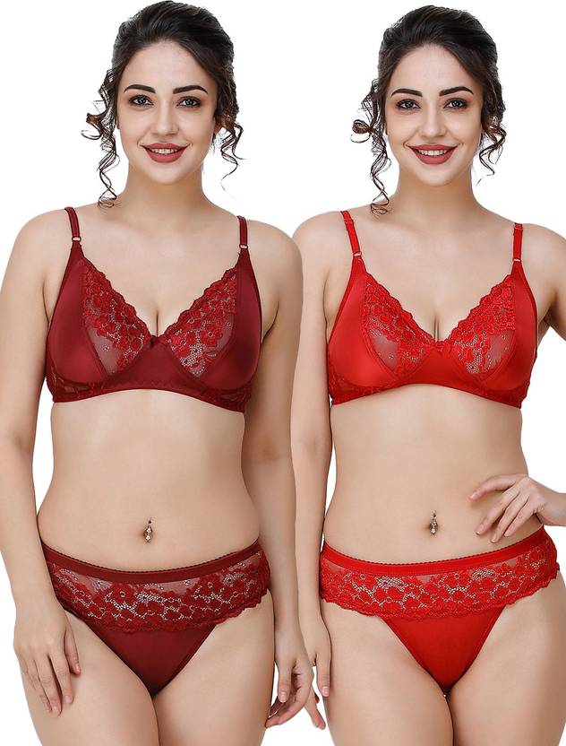 Bra & Panty Set Self Design Maroon, Red Lingerie Set