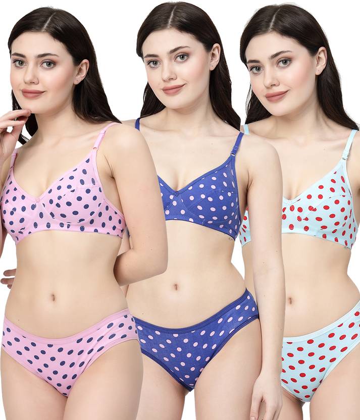 Docare Pink, Royal Blue, Turquoise Blue Polka Print Non Padded Bra & Panty Set
