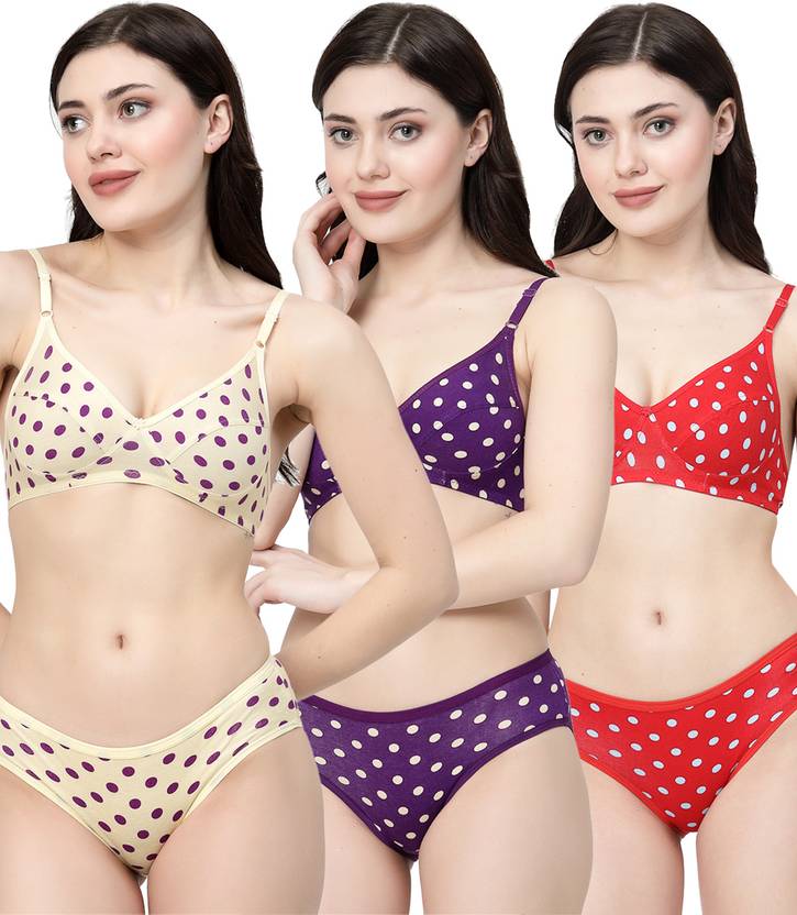 Docare Yellow, Purple, Red Polka Print Non Padded Bra & Panty Set