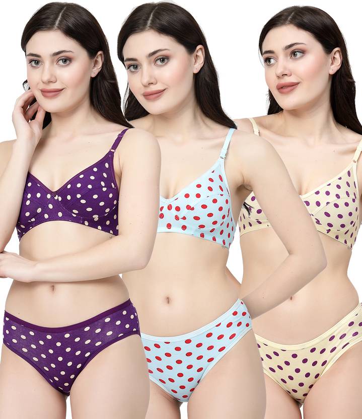 Docare Purple, Turquoise Blue, Yellow Polka Print Non Padded Bra & Panty Set