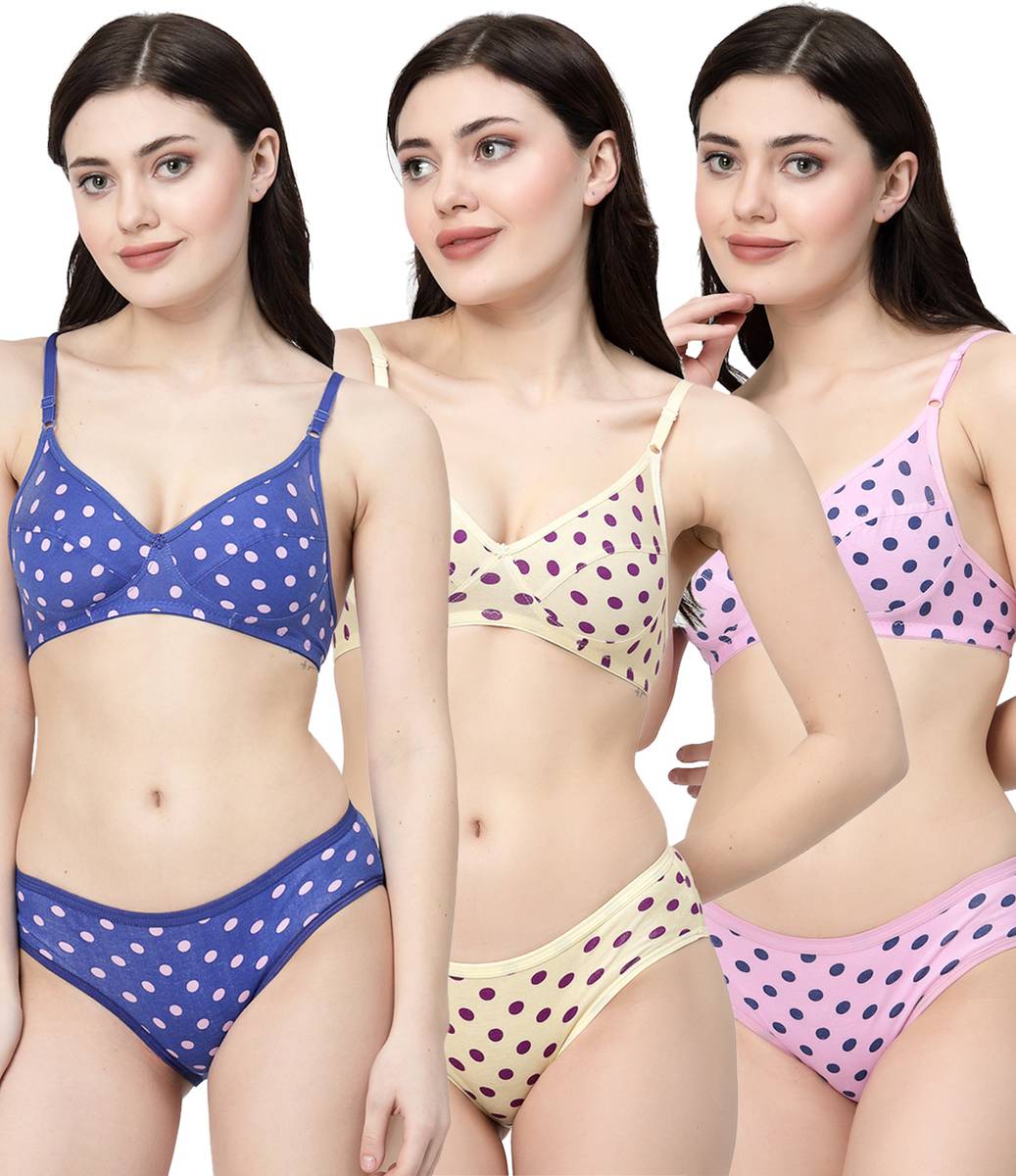 Bra & Panty Set Polka Print Dark Blue, Yellow, Pink Lingerie Set