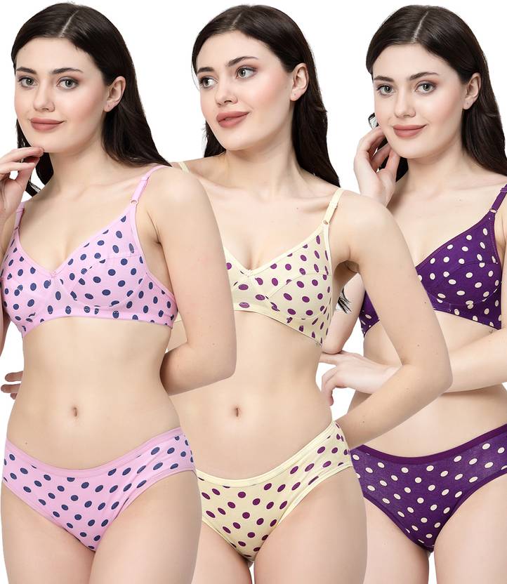 Docare Pink, Yellow, Purple Polka Print Non Padded Bra & Panty Set