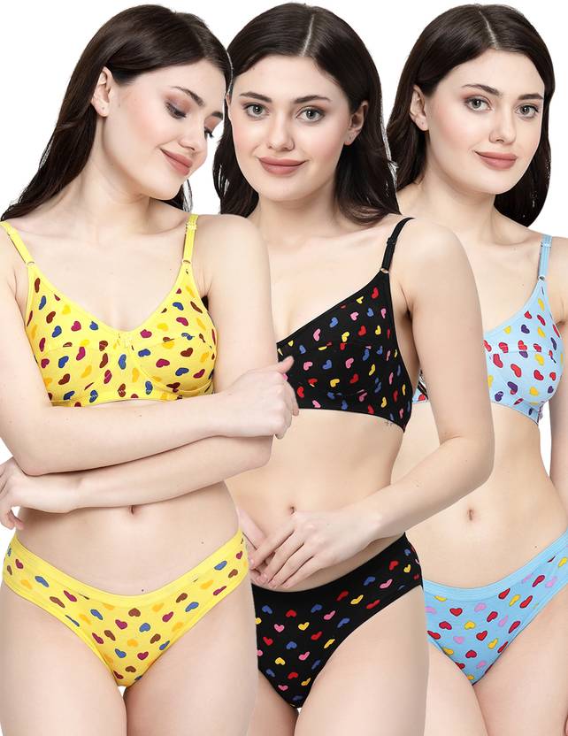 Bra & Panty Set Printed Yellow, Black, Blue Lingerie Set