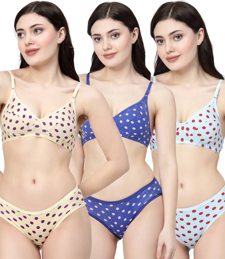 Docare Yellow, Royal Blue, Turquoise Blue Polka Print Non Padded Bra & Panty Set