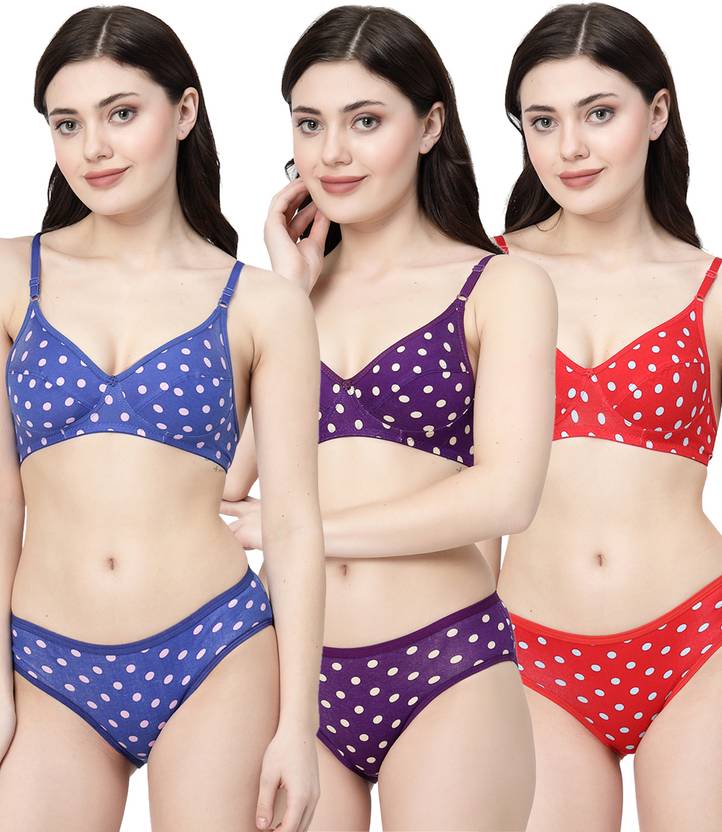 Docare Royal Blue, Purple, Red Polka Print Non Padded Bra & Panty Set