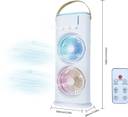 Experience ultimate cooling comfort with this innovative portable mini air cooler fan featuring dual-spray technology. The sleek white design houses two powerful fans with mesmerising RGB lighting effects that create a stunning rainbow display while keeping you cool. This versatile device combines a cooling fan with a mist humidifier for enhanced comfort in any environment. The convenient remote control allows easy operation of multiple functions including spray intensity and fan speeds. USB rechargeable with a generous 1.5-metre cable, this quiet-operating fan is perfect for your desk, bedside table, or anywhere you need a refreshing breeze. The built-in water tank enables continuous misting operation, while the portable design with a stylish handle makes it easy to move from room to room. Ideal for home offices, bedrooms, or while travelling, this compact cooling solution offers both functionality and aesthetic appeal.